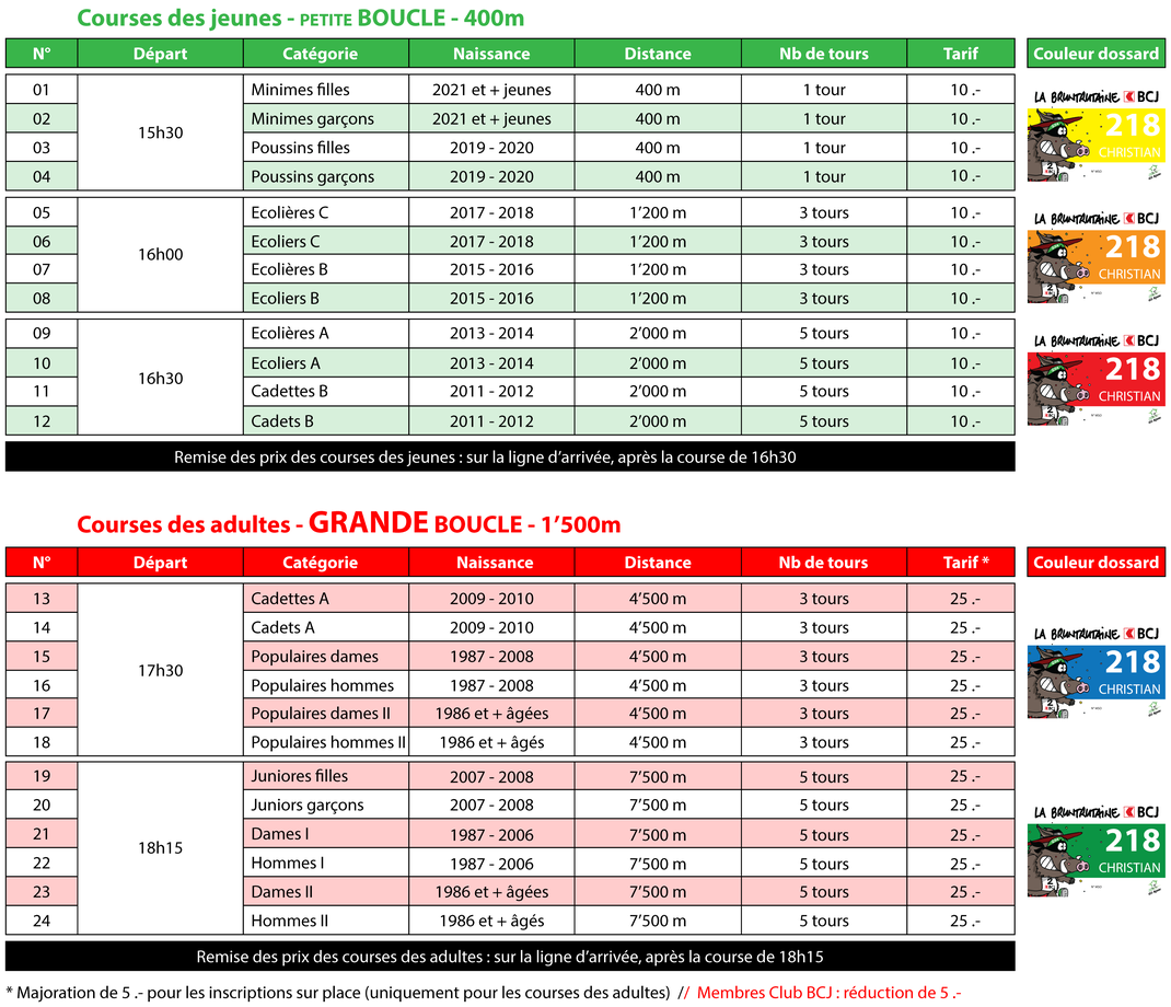 Deux coureurs sur 4.5km et deux coureurs sur 7.5km forment une équipe. Le classement est établi sur le cumul des temps des quatre coureurs. Les coureurs sont également classés individuellement dans leur catégorie respective. Un seul classement regroupera toutes les équipes. Des prix spéciaux seront tirés au sort.