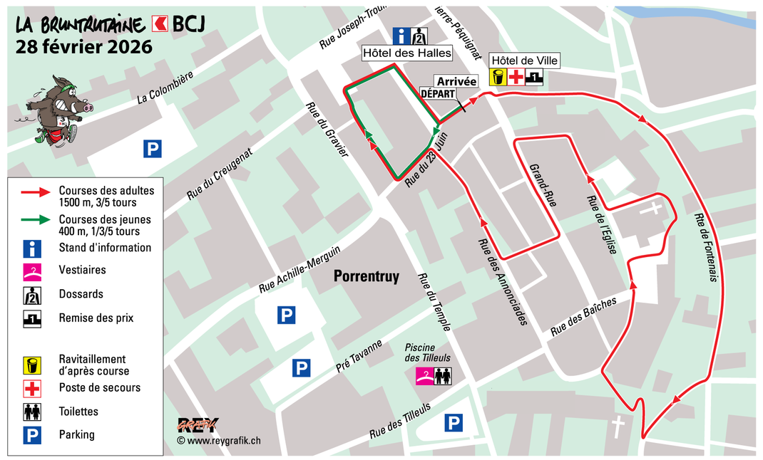 Après un départ à la rue du 23-Juin (à la hauteur de Jura Tourisme), vous courez en direction de l'Esplanade (Migros), puis du jardin botanique. La première difficulté vous amène au Lycée cantonal, en passant au pied de l'église des Jésuites. Une fois en-haut, vous vous dirigez vers l'Eglise St-Pierre et la contournez par la droite. Vous descendez ensuite jusqu'à la fontaine de la Samaritaine, pour remontez la Grand-Rue. Le passage dans la rue des Annonciades se fait par une jolie ruelle. La descente jusqu'à la Poste de la Chaumont est longue de 300m avant de retrouver le plat. Vous remontez à droite direction la ligne d'arrivée. Si vous n'êtes pas à la fin de votre 3ème tour (pour la course des 4.5km) ou à la fin de votre 5ème tour (pour la course des 7.5km), il faudra poursuivre tout droit une fois la ligne passée pour continuer la course.